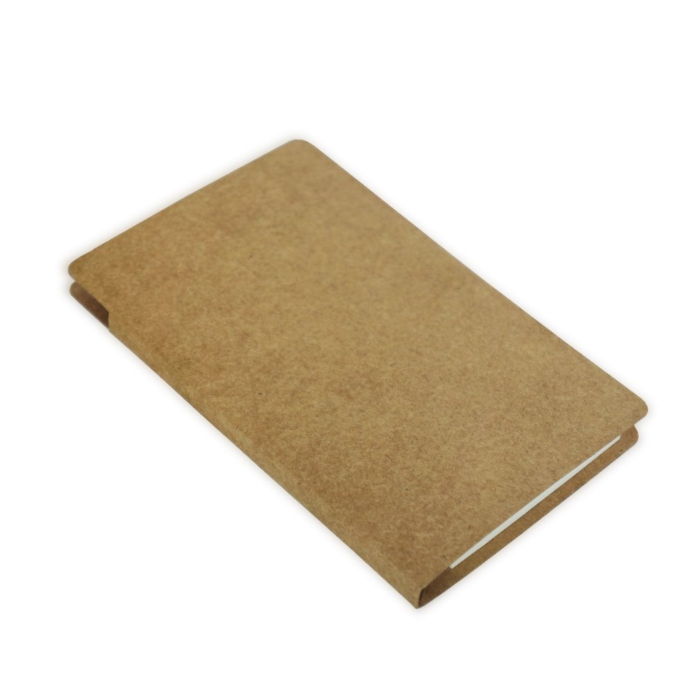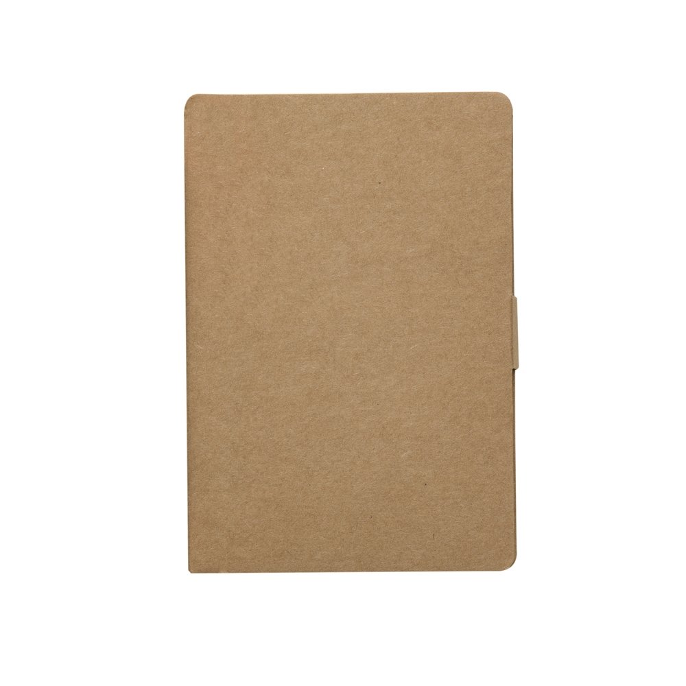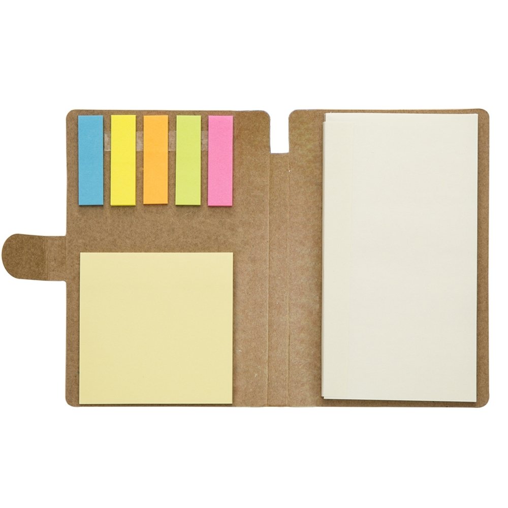 Bloco de anotações ecológico, material em kraft. Possui uma trava na própria capa, cinco blocos auto-colantes coloridos com aproximadamente 25 folhinhas , bloco de post-it amarelo com aproximadamente 25 folhas e bloco grande com aproximadamente 70 folhas.