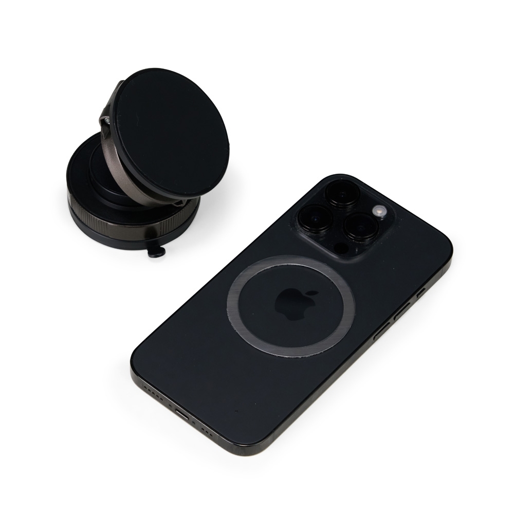 Descrição: Suporte magnético em plástico ABS com articulação em diferentes ângulos e rotação de 360 graus no próprio eixo. Possui superfície magnética para fixação de aparelhos na vertical ou horizontal, compatível com dispositivos magnéticos ou com o anel adaptador incluso. Conta com mecanismo giratório para pressão da ventosa em superfícies lisas. Acompanha anel magnético adesivo, placa plástica com adesivo, kit de lenços e chave Allen.