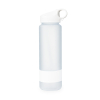 Descrição: Squeeze plástico com acabamento fosco, marcação de volume e capacidade máxima de 900ml. Possui tampa rosqueável com alça fixa, bico flip e canudo interno removível. Acompanha tira emborrachada removível.