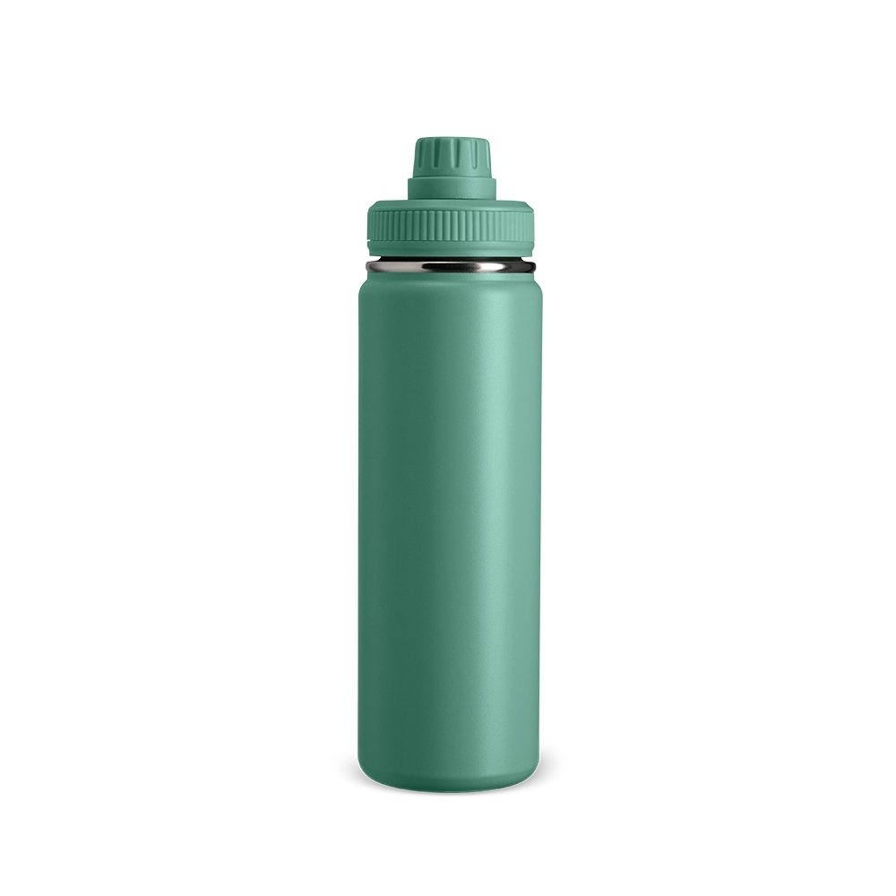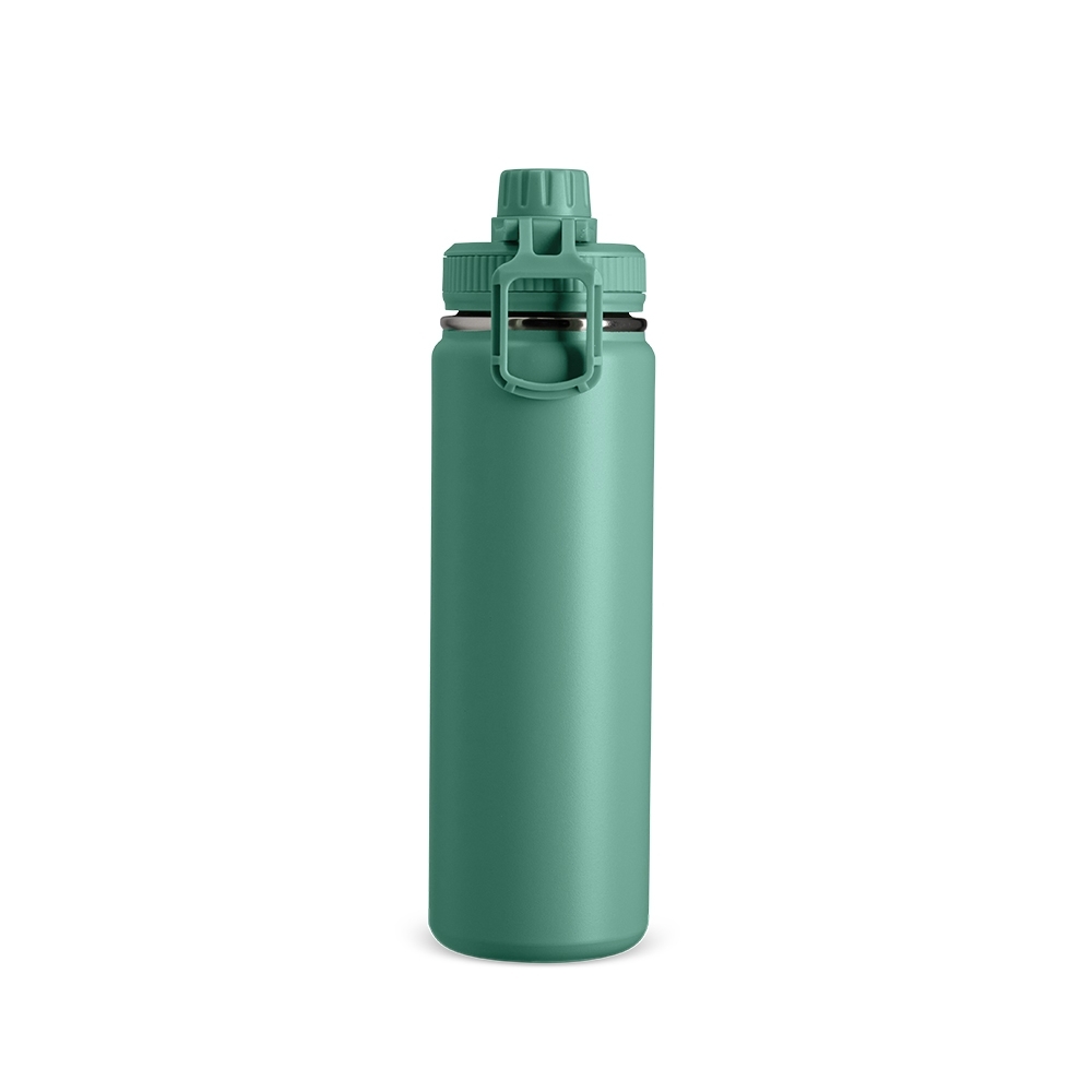 Descrição: Garrafa térmica feita em inox com pintura eletrostática e capacidade de até 750ml. Possui estrutura em parede dupla e isolamento a vácuo, o que permite manter a temperatura de líquidos conservada por mais tempo. Conta ainda com tampa rosqueável em plástico, protetor para o bocal e alça retangular para transporte.